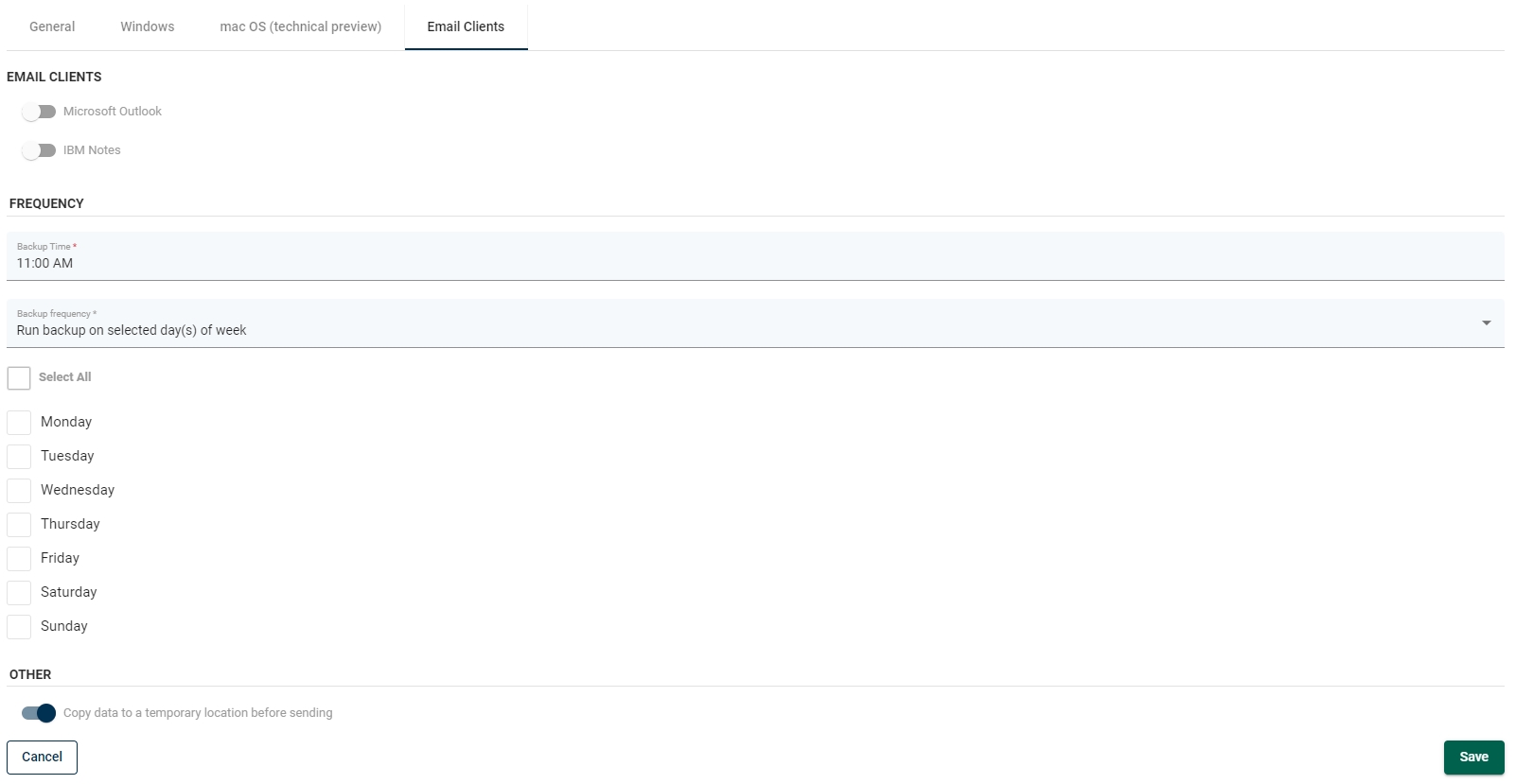 The Storware Endpoints server can protect email clients' archive files (in the PST or NSF format). Select the email client you want to protect (MS Outlook, IBM Notes), and set the following options: