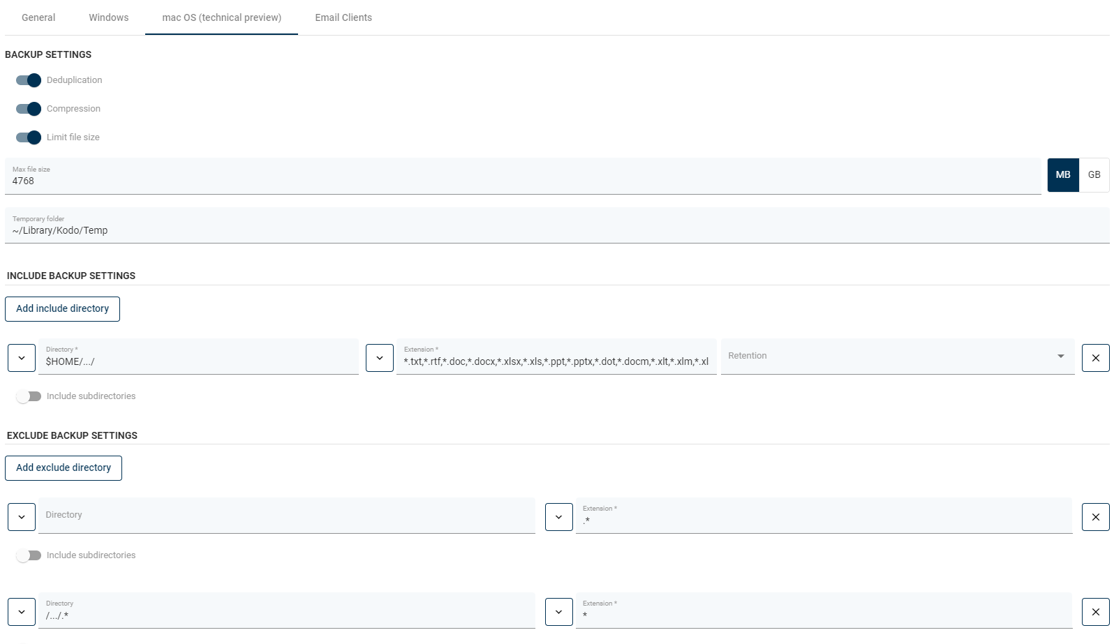In this section, you can define directories and extensions you want to be excluded from the backup policy. To add a directory to protect, click the Add exclude directory button.