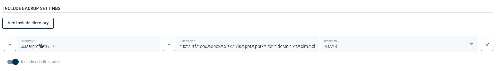 In this section, you can define directories and extensions to be included in the backup policy. To add a directory to protect, click the Add include directory button.
