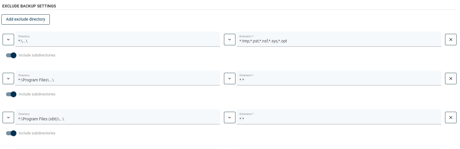 In this section, you can define directories and extensions you want to be excluded from the backup policy. To add a directory to protect, click the Add exclude directory button.
