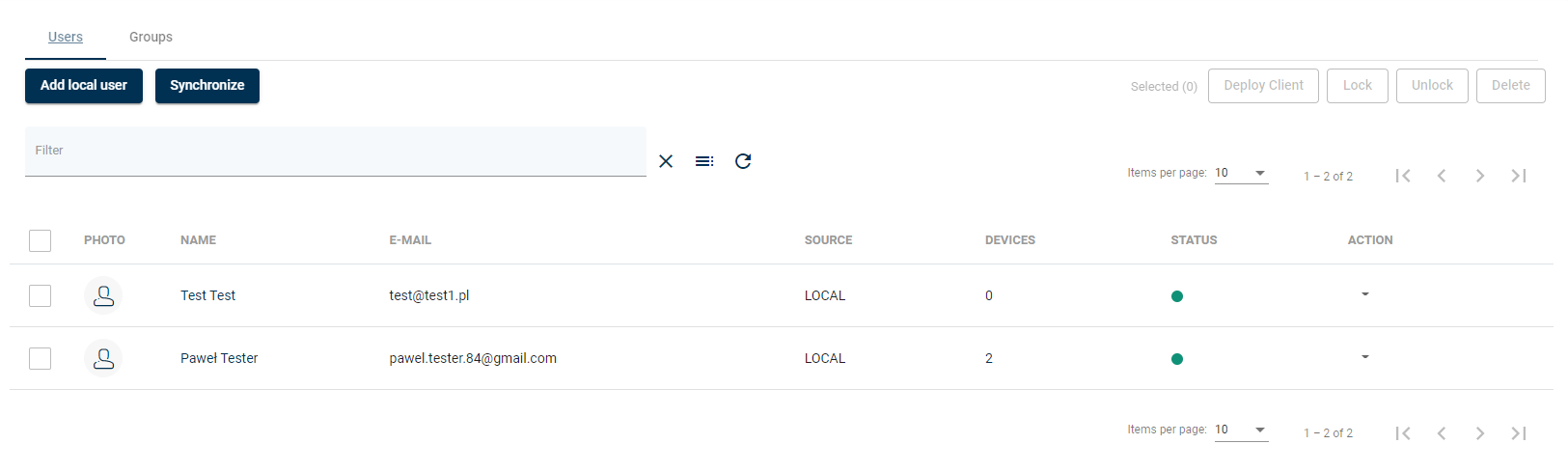 To synchronize LDAP users, click the Synchronize button. The users will be displayed on the user list. If the user account has been locked on the LDAP server, the user account is also locked on the Storware Endpoints server.