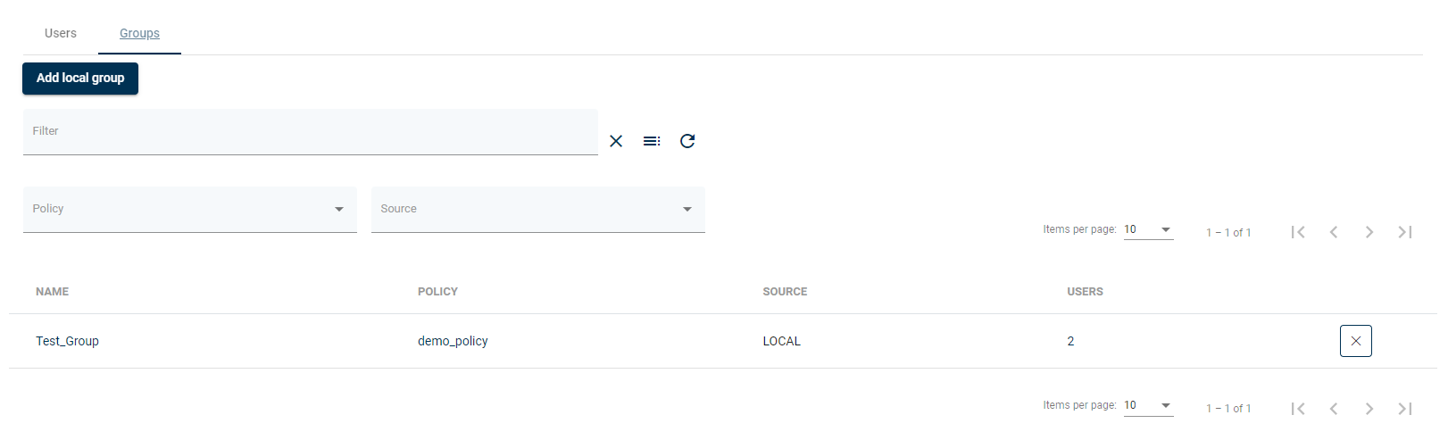 The Search field allows searching for a user account within the filtered range. You can narrow the search by choosing a group, a policy, a status, or a source range.