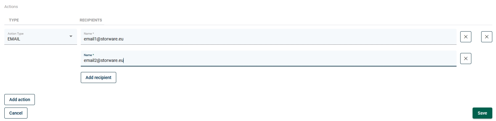 The last step is to add an action with related recipients. Click Add Action button, choose Action Type from a list, add one or more recipients passing their email addresses.