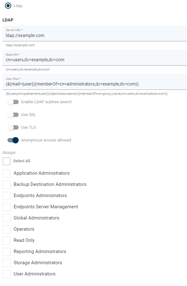 - LDAP server URL (if you want to use fqdn of server url you need to use DNS on Server machine or add line in/etc/hosts