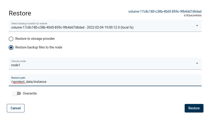 Restoring to the filesystem is an option to restore directly to the Storware Backup & Recovery node storage. (Remember, the Storware Backup & Recovery user must have the appropriate write permissions to the given path.)