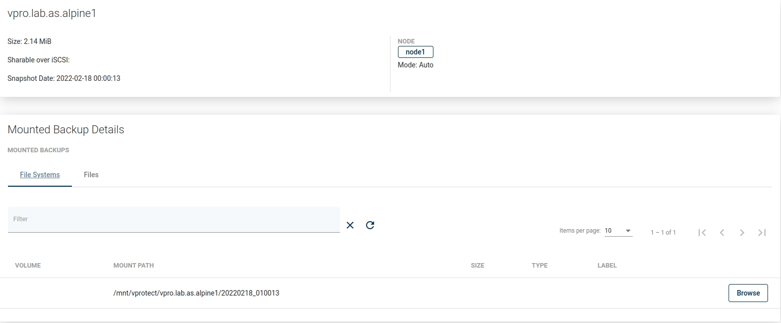 VIRTUAL MACHINE- mounted virtual machine nameMODE- Auto - Storware Backup & Recovery auto-detect filesystems and mount it on path "/mnt/vprotect/". In Manual mode, the user chose a mount point for selected filesystems.NODE- Storware Backup & Recovery node responsible for mount job.SNAPSHOT DATE- date of mounted backup of the VM.FILE SYSTEMS- a number of mounted filesystems.FILES- a number of mounted virtual disk images.