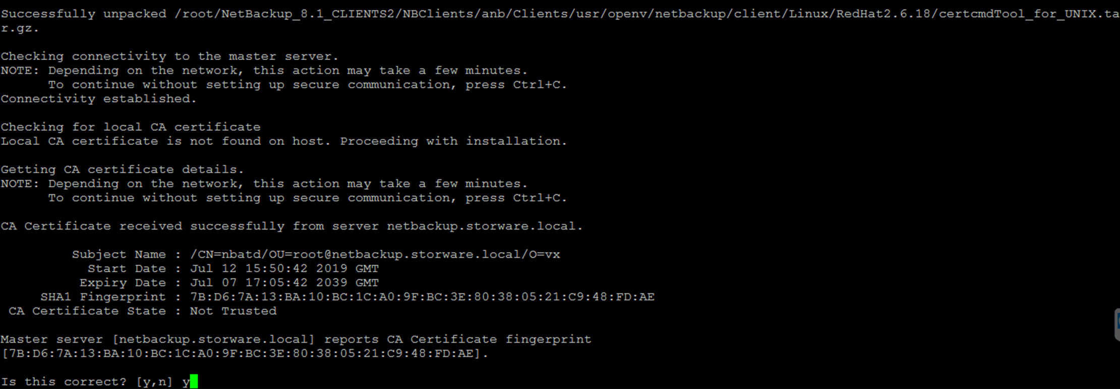 After you have confirmed the fingerprint information, the installer stores the authority certificate details.