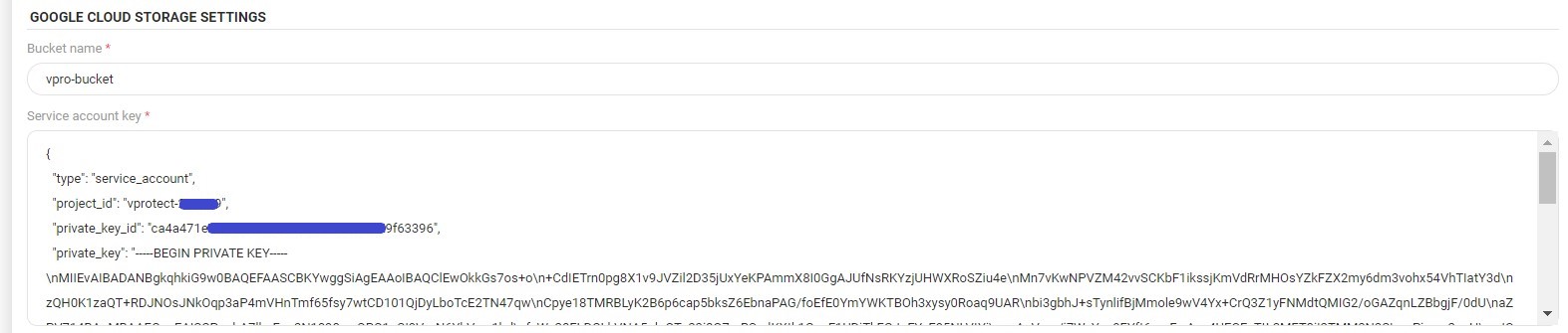 The Service account key - paste the content of the service account key .json file created before.