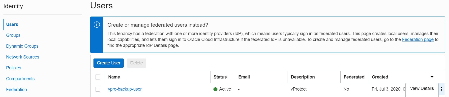 Now we need to create a user that we will use to authenticate our backup destination. Please go to the Users tab under the Identity tab in the menu on the left.