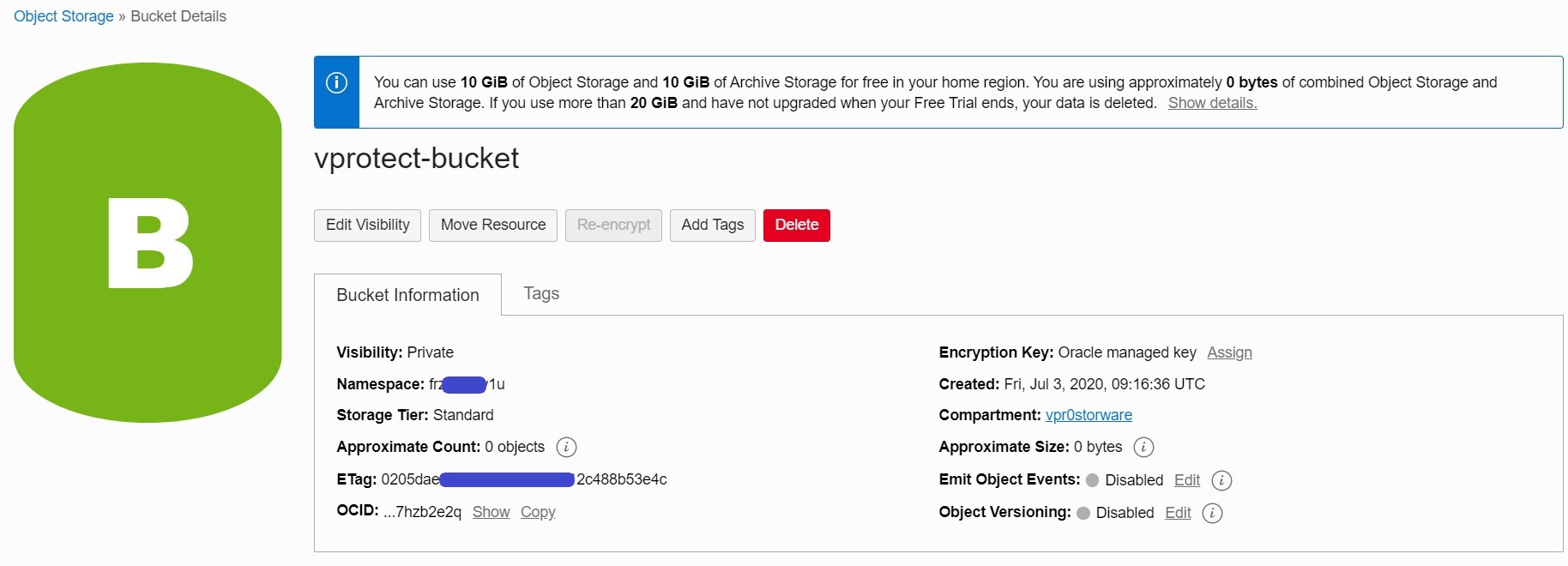 After creating the bucket, you'll see a list of buckets. Click on the name to view the details of the object. Remember the "namespace", we also need it when creating a backup destination.