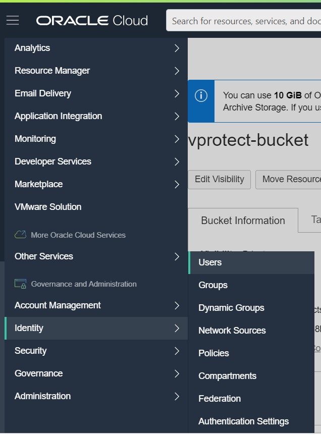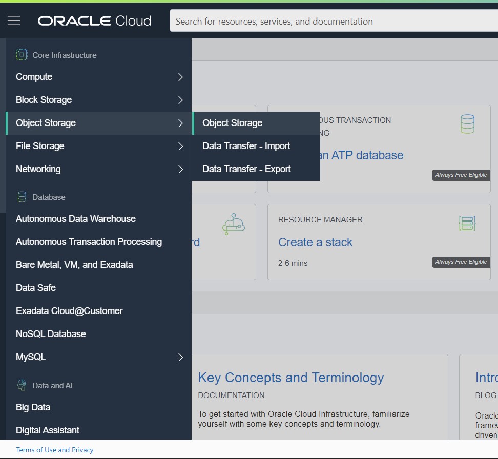 Log in to the Oracle cloud dashboard, expand the left side menu and go to the Object Storage tab.