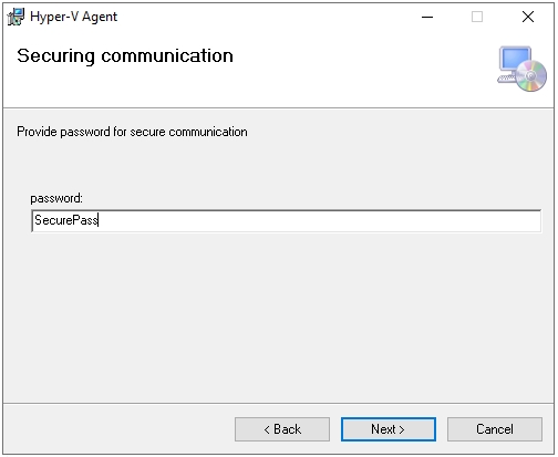 Provide a password for secure communication (you will need it to add Hyper-V to Storware Backup & Recovery). And accept it by clicking Next.