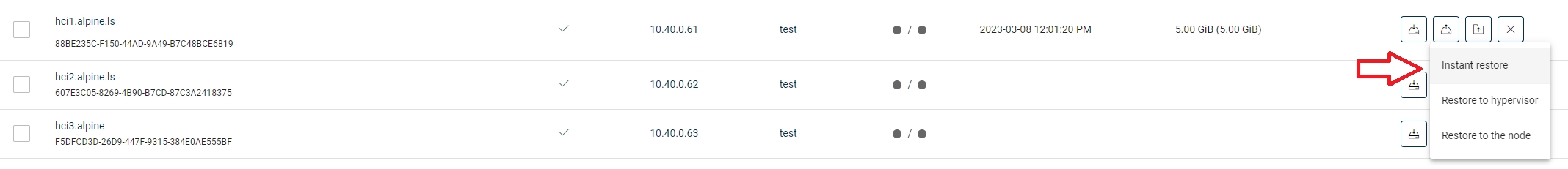 Go to the Instances page and select the restore button next to the virtual machine which you want to restore. From the context menu, select Instant Restore