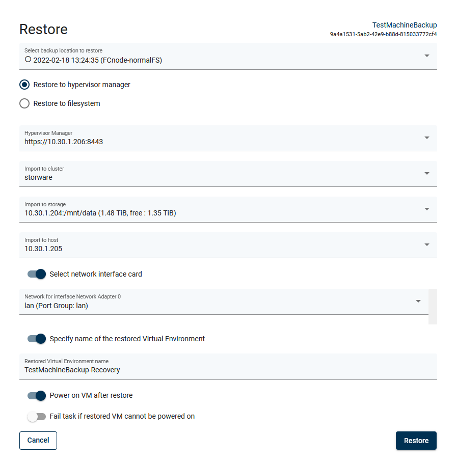 If the host is set to None, then a cluster must be selected and the VM will be restored to that cluster