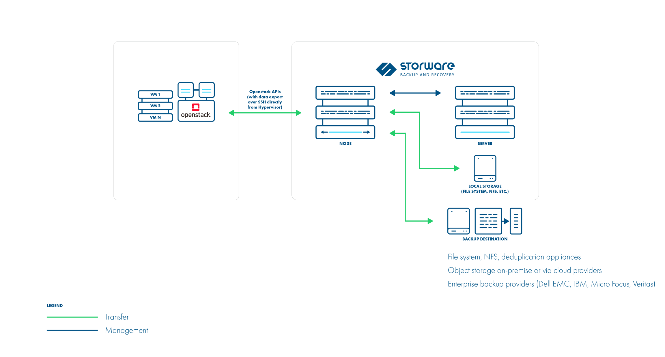 Storware Backup & Recovery supports OpenStack environments that use KVM hypervisors and VMs running on QCOW2 or RAW files. Storware Backup & Recovery communicates with OpenStack APIs such as Nova and Glance to collect metadata and for the import of the restored process. However, the actual backup is done over SSH directly from the hypervisor. The process is exactly the same as in Deployment in the KVM/Xen environment. Storware Backup & Recovery Node can be installed anywhere - it just needs to have access to the OpenStack APIs and hypervisor SSH via a network. Both full and incremental backups are supported.