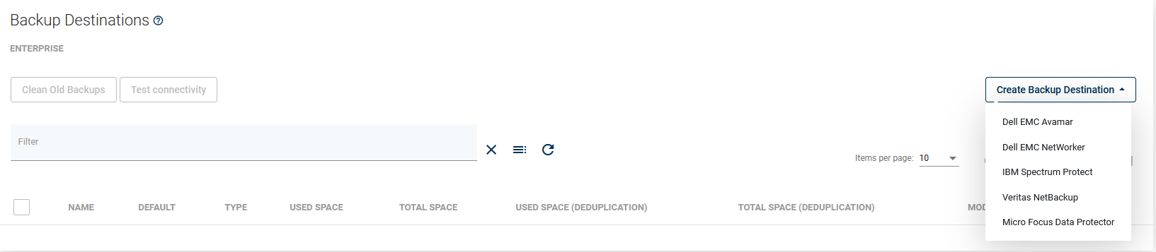 On the left side menu, click on Backup Destinations, then change to the enterprise sub-tab, click on the Create Backup Destination button and choose: