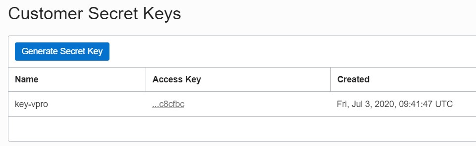 Scroll down and open the "Customer Secret Keys" tab. Click on "Generate Secret Key".