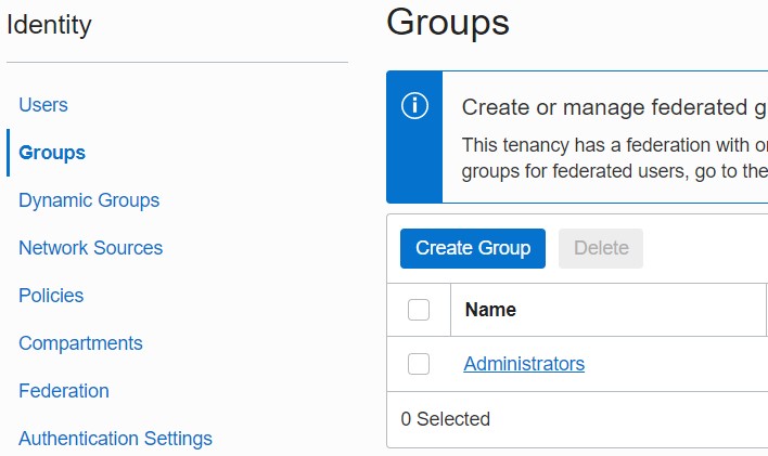 Then go to the Groups page, which you can also find under the identity tab in the left side menu.