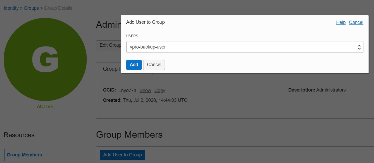 Now click on "Add User to Group" and choose the user you created previously.