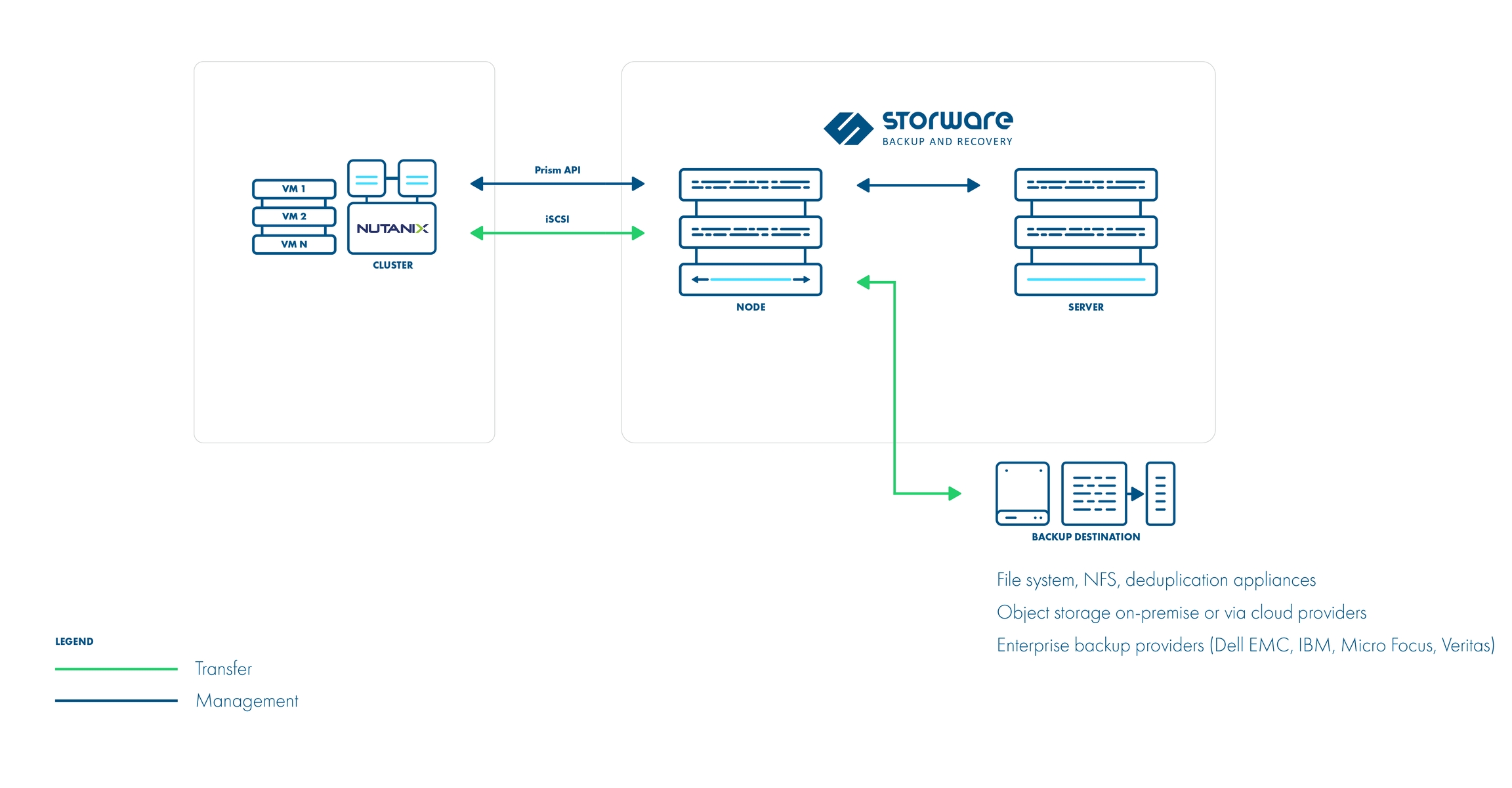 Storware Backup & Recovery supports volume groups for the Nutanix platform. Disk snapshots are being attached to the host with Storware Backup & Recovery Node using iSCSI. Thanks to this backups and restores can be performed remotely without Proxy VM.